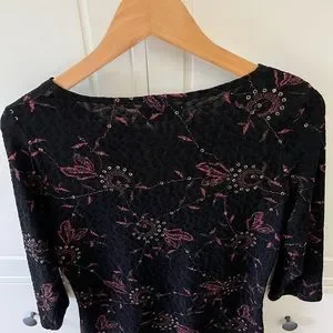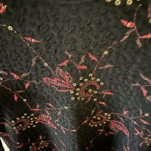 Super chic black blouse with red and gold design. Material has stretch. Size medium.