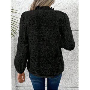 Notched Neckline Lantern Sleeve Eyelet Embroidery Blouse Black