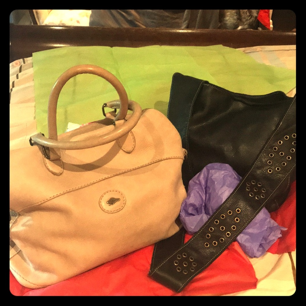 ❤️ Oh Canada! Oldies but goodies. Left bag is Shoulder bag in light tan leather, clean interior, structured but soft, Comes with CB strap, #2 is a soft wide w/ matte gold studs, CB strap. Bag is light and cool! Interior is a little dirty but no obvious stains.