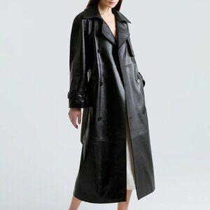 The Henri Leather Trench Coat is hailed as an iconic piece crafted in buttery-soft leather. It showcases a timeless double-breasted silhouette, broad collar, and belted cuffs—masterfully balancing refined structure with everyday comfort. It’s cut to a loose fit and is designed to be worn true to size.