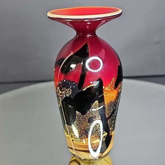 Nourot Signed Studio Glass Incense Vase Jar 4.5” Tall Red Gold Black USA