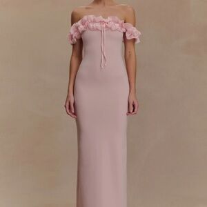 Selling this stunning dress from Meshki called "Nova Ruffle Off Shoulder Maxi Dress" in the colour "Ballet Pink" in size XXS.
