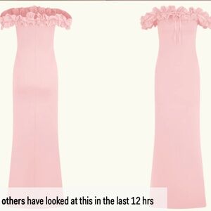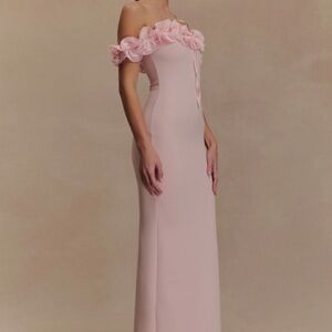 Link to dress for additional information: https://www.meshki.us/products/nova-ruffle-off-shoulder-maxi-dress-ballet-pink