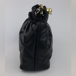 This shoulder bag from Nove is crafted in a black quilted vegan leather, and features gold-tone hardware, two shoulder straps looped through a gathered top, metal detailing on the front, and a removable keychain with a dangling quilted-texture sphere on the end. Secured by magnetic closures, the top opens to a tonal textile-lined interior.