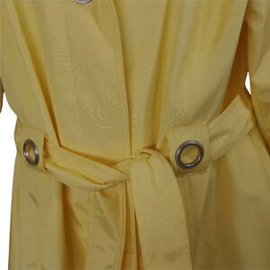 Lovely, bright 'spring is on the air' kind of coat! Wind and water resistant. Bright, mellow-yellow colour. Metal, silver coloured accents. Belted tie at waist. Large lapel collar. Front pockets. Full inner lining. Lightly padded shoulders.