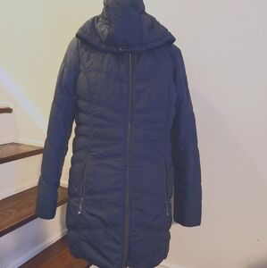 Coat comes with a detachable hoodie, beautiful lining and side zip pockets. Large size in dark blue in good preowned condition.