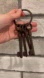 Large novelty keychain decoration. It’s a mottled brown/black metal set. They have a vintage look. Midieval, Renaissance, LARP. Can be attached to a costume.