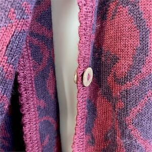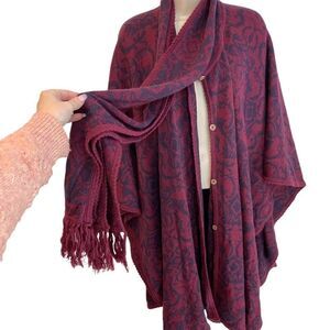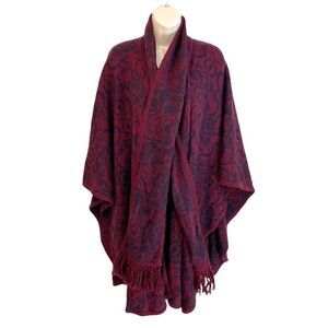 • Modeled after the Andean ruana, a traditional style of draped cloak, its pattern of flowers in boysenberry-purple and burgundy is inspired by the wildlife of the Peruvian mountainside.