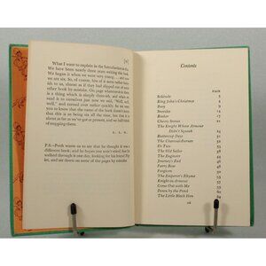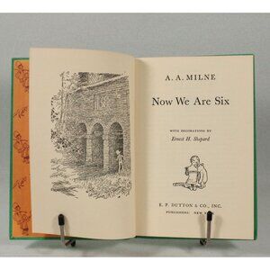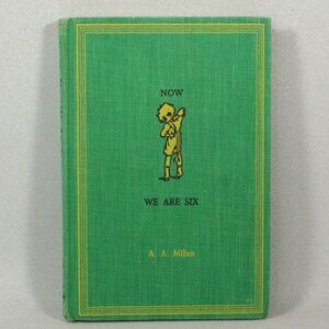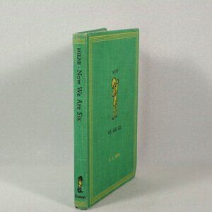 Now We Are Six is a best-selling book of poetry by A. A. Milne, illustrated by E. H. Shepard. This edition was published by E. P. Dutton in 1961. It has a green cloth bound hard cover with black and yellow lettering and illustrations on the cover and spine.