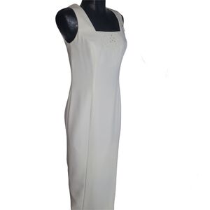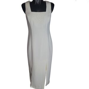 Dress is maxi in length with a front side split seam. Has a square neckline with a back zipper closure that goes halfway down. Has a full white polyester lining.
