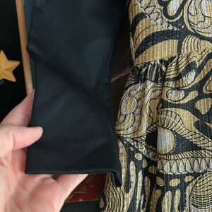 This chic dress features a sleek black top paired with a stunning gold patterned skirt. Ideal for any occasion, it offers both elegance and comfort.