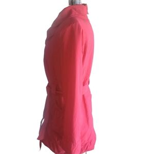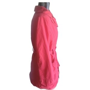 Stylish and vibrant red mid-length coat perfect for any occasion. Features a button-up front and a flattering fit. Has a matching fabric belt and 2 side pockets.