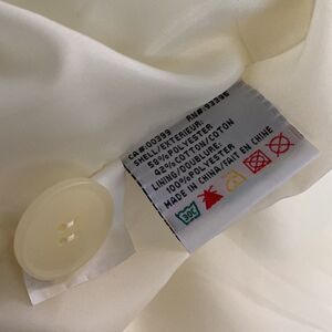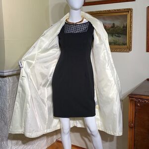 In excellent preowned condition with no stains or flaws gorgeous Nuage ivory white trench coat in a shimmering polyester satin fabric. Classic detailing with feminine design, button front, belted, front pockets, fully lined.