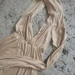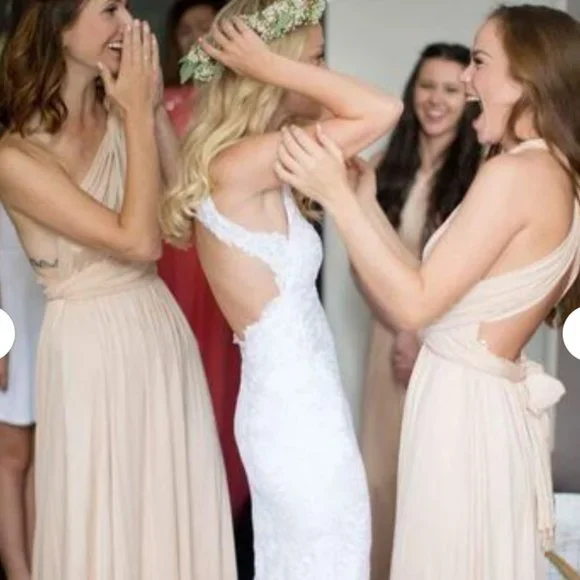 Beautiful infinity wrap dress in nude. SIZE 0-8. A stretch band waist allows it to fit various sizes. Perfect condition, only worn once. Great for weddings or special events!