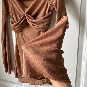 Nude off-the-shoulder long sleeve top with ruched detail Mesh and stretchy Y2k