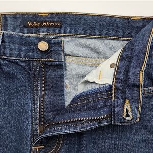 Excellent pre-owned condition, Nudie Jeans Co. Slim Jim Broken Twill 100% organic cotton dark wash denim jeans, size 30 x 34.