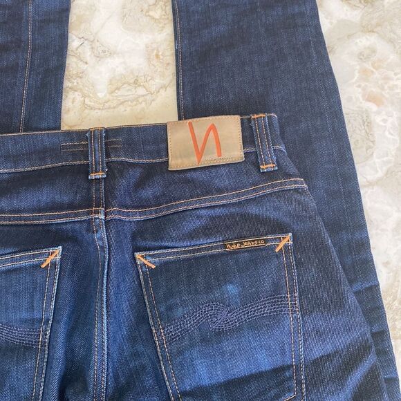 In excellent preowned condition, these Nudie Jeans feature a straight slim fit, made in organic comfort stretch denim. With its slim fit, mid waist and straight leg Grim Tim is one of Nudie’s most popular slim fits.