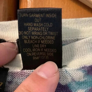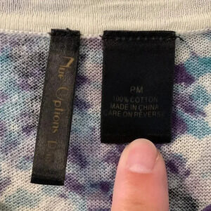 Gorgeous set in Petite Medium. Light knit with stretch. Abstract pattern in blue, purple, black and white. Black buttons.