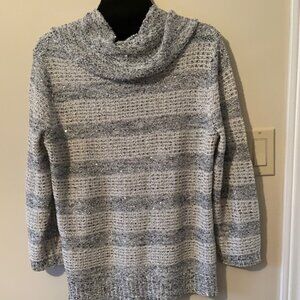 Nue Options White/Grey with Tiny Sparkling Silver Discs Sweater with Cowl Collar – Size XL - fits loose - lightweight soft polyster material – it’s the right season to wear it with a pair of black pants/leggings - comfortable wear -oversized - 100% polyester -lightly ribbed hem, ¾ length sleeves , cowl neckline - measurements from under the arms - 21” across chest – 16” side length – 23” back length from neck to hemline - front from neck to hemline 19” – 13” under arm sleeve length – top shoulder seam 3” – excellent condition - smoke/pet free home - make an offer - fast shipping – create a bundle and save $$$$