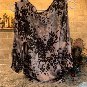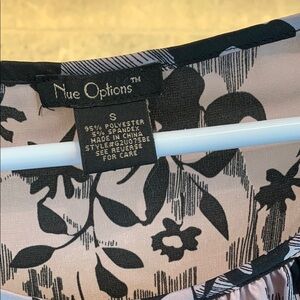Embrace effortless style with this relaxed blouse from Nue Options, showcasing a chic pleated design in a sophisticated black and pink palette. The blouse is cold shoulder with the cold shoulder opening of 10 inches. Pit to pit is 18 inches. Enjoy a comfortable fit that seamlessly blends style and ease. This blouse is stunning and in excellent condition, sadly it no longer fits. You will not be disappointed!