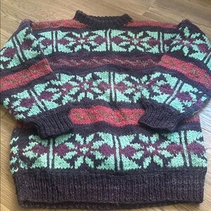 Vibrant knit sweater with intricate patterns. Features shades of purple, teal, and red. Super fabulous sweater and perfect to be stylish this winter in.