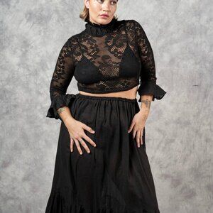Black Lace High Collar Crop Top Blouse in size II. Made by small Canadian business Nuit Atelier. Beautiful black cotton lace top with tie ribbon on the back of the neck. Material has stretch. In excellent, very lightly used condition. Absolutely gorgeous!
