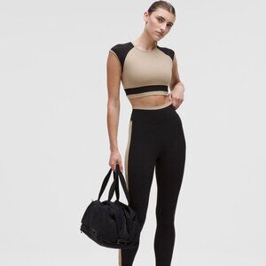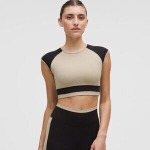 Press play. This nearly weightless, sweat-wicking studio top features retro colourblocked panels for a sporty look with a buttery-soft feel. Color is Sheer Oak/Black. Size M.
