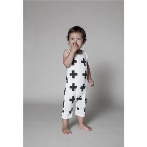 A cozy piece in ribbed soft cotton and a bold plus print. A tank top and ¾ pants make this a playsuit great for warm weather. Snaps at the shoulder and inner legs make for easy changing. Perfect for everyday comfort.