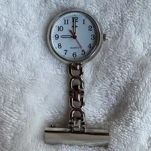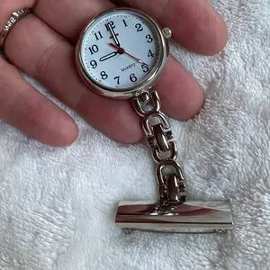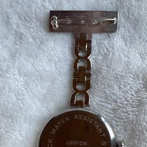 Stainless steel and water resistant nurse watch. Red Cross on face of clock. Pin on watch. Needs battery