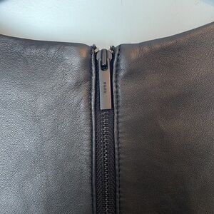 NWOT - tag on lining to be removed before wearing or cleaning is still intact. Beautiful and super soft lamb leather dress by DKNY. V-Neck, cinch-tie waist with two front pockets. Zipper back closure. Fully lined.