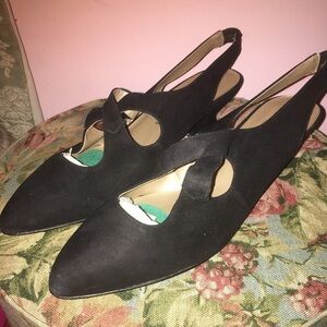 Kitten heel suede sling back style sandals have criss cross strap design and detailing on the bottom of the heels.