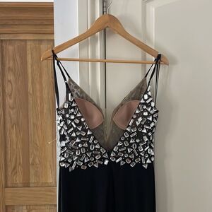 Geometric jewels embellish the mesh bodice of an alluring gown fashioned with a thigh-high side slit and floor-grazing hem.