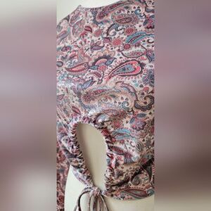 keyhole opening at front with cinch drawstring, paisley print, super soft with slight sheen, beautiful unique peice, boutique brand