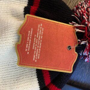 American Needle Coca Cola Pillow Line Beanie in Black, Ivory and Red. Features a pom on the top, embroidered Coca Cola along the rolled up hem and has striped detailing around. Beanie. Black, red and ivory colourway. Pom. Rolled hem. Embroidered logo. Striped. Retails for $39 USD (approximately $54 CAD). Brand new with tags! No flaws.
