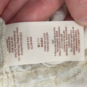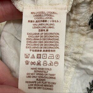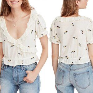 Free People Full Bloom Ruffle Top in Ecru Combo (Ivory White) and Women's Size Large. Tiny scattered embroidered blooms pattern a romantic top trimmed with frilly ruffles. Surplice neck. Lightweight knit. Short sleeves. Pretty ruffles trim every edge. Sequins accent trim at neckline, cuffs, hem and sides. Approximately 18" length. 85% lyocell and 15% linen. Hand wash. Brand new with tags! No flaws. Retails for $78 USD (approximately $108 CAD).