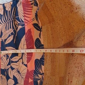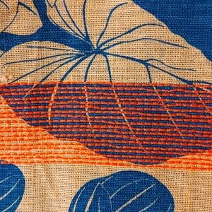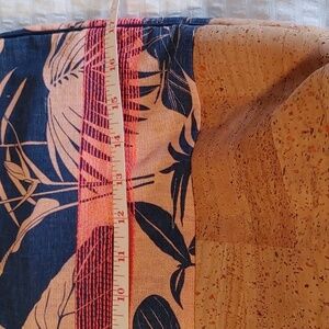 - beautiful roomy tote with navy blue handles , cork bottom, bright orange embroidered detail with navy and tan botantical pattern