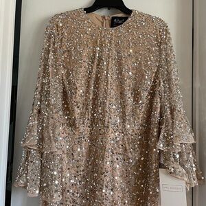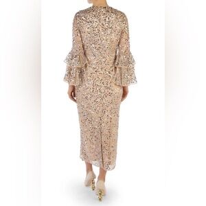 NWT Mac Duggal Fully Sequined Ruffle Tiered 3/4 Sleeve Midi Dress - Nude