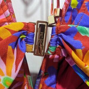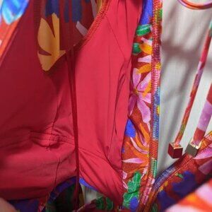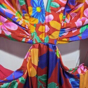 This beach dress features a Lycra bodysuit attached to a flowy skirt and billowing sleeves in an lightweight chiffon fabric. Diamond-shaped ribcage cut-outs show just the right amount of skin. Subtle shoulder structure is created from Lycra-covered crinoline cap sleeves that are sewn-in by hand. Flowing A-line skirt with two high side slits. Bodysuit features a bottom snap closure. Open back with adjustable lace-up closure.
