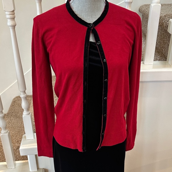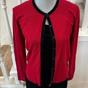 Nwt. Velvet accent on collar and button strip. Vibrant red with black. Can be cardigan or sweater. Question is a Holland made brand. Very good quality