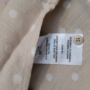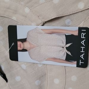 Cuffed short sleeves, buttons up the front and ties at the bottom.