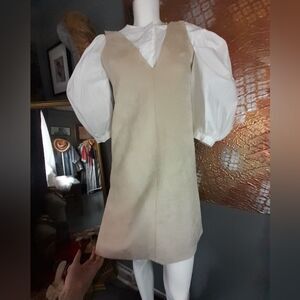Zara Nwt beige sleeveless pinafore style faux suede dress. brand new, never worn. perfect condition. deep v front and back, pullover style. a line. very soft and plush feeling. see pics for material composition. size small. see flat lay measurements below!