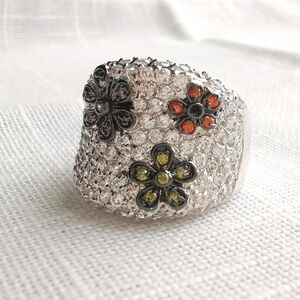 New with tags silver ring featuring a pave setting with three flower designs, each in a different color. The workmanship is excellent, with a no-snag setting. The ring has a 14K white gold overlay for tarnish resistance (GEP stamp). Size 8.