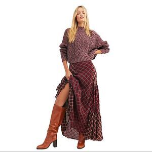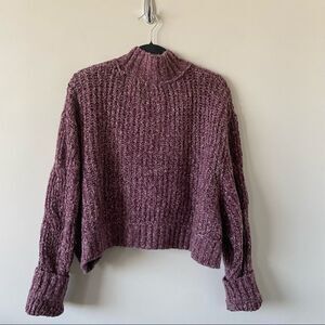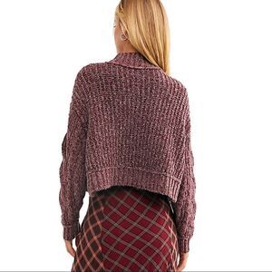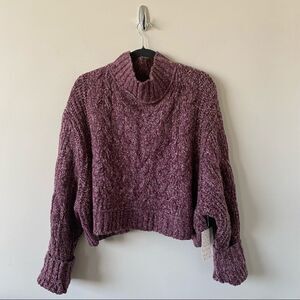 Free People Merry Go Round Crop Sweater in Very Berry featured a mock turtleneck, drop shoulder long sleeve, crop silhouette is a soft cable knit. Unlined.