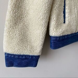 The cozier counterpart to the classic Ex-Boyfriend Trucker Jacket. A relaxed, borrowed-from-the-boys silhouette lined with fuzzy sherpa for warmth and comfort. And this one is made with a unique, pieced construction for a fresh take on the classic sherpa style perfect for Winter.