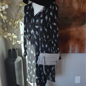 New with tags, long sleeve midi rayon dress, v neck cutout at front with tassels, black with leaf/petal design. made In canada. purse and hat also for sale in my closet. bundle and save