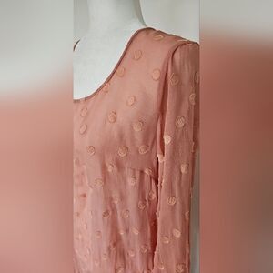 long sleeve, textured polka dots , slits in sides, sheer, crew neck, new with tags,
