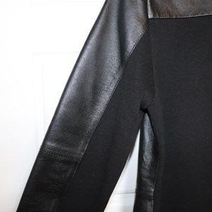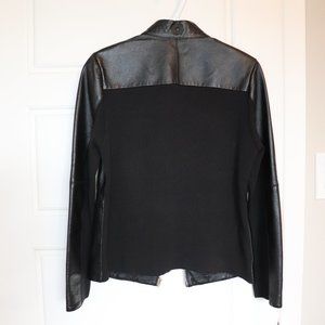The front of the jacket and tops of the sleeves are leather (or leather imitation, I can't tell, but it doesn't look like cheap pleather), the back is a mid-weight ribbed jersey material, which makes this jacket fit more comfortably, and less boxy, that normal leather jackets. Beautiful front embroidery detailing.