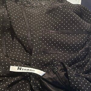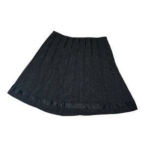 Elegant Nygard black polka dot skirt in a sheer lace overlay with subtle satin stripe accents. Fully lined, bias cut, and beautifully flowy — a timeless and feminine piece perfect for both professional and dressy looks.