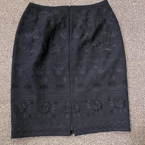 Beautiful Black Pencil Skirt with Black Beads and Embroidery. Fully Lined. 1/2 Zip at Back. 30" waist, 24" waist to hem.