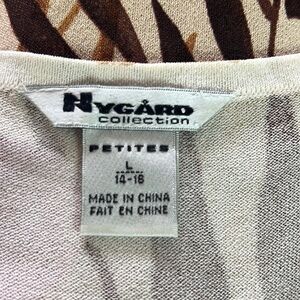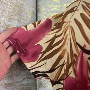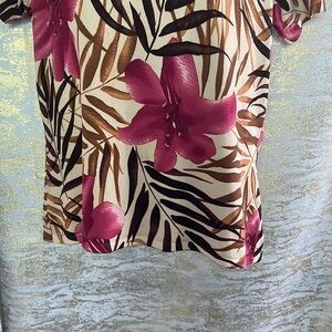 - Gorgeous Nygard collection Rayon/nylon blend lightweight top with beautiful floral print. Rose colored flowers with various tan toned leaves and background.